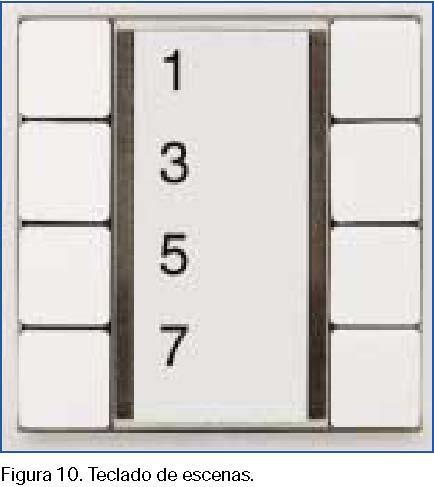 El teclado de escenas (figura 10), per-mite grabar una configuración luminosa, y después reproducirla de forma bien sencilla, con solamente pulsar un tecla del mismo teclado, de otro, o bien de un mando a distancia. De esta forma, al inquilino le resulta fácil manejar la iluminación, y la va modificando sobre la marcha en función de las necesidades del acto que se esté llevando a cabo.