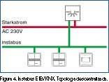 El sistema Instabús EIB/KNX está basado en una topología descentralizada (figura 4), en la cual sensores y actuadores se comunican entre sí mediante un par trenzado de baja tensión de seguridad, 24 V. Este par proporciona la alimentación para la electrónica de los distintos componentes, y también transmite la información entre ellos.