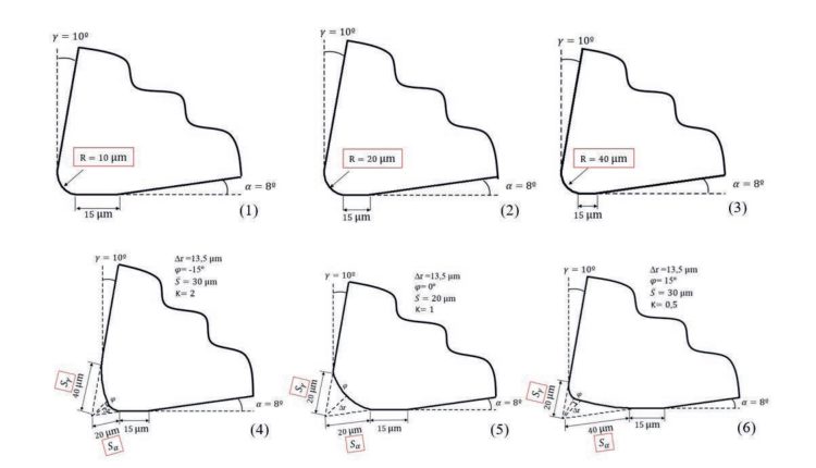 ?m (1), 20 ?m (2) and 40 ?m (3); Asymmetrical roundings with parameters S = 20 ?m and S = 40 ?m (4)