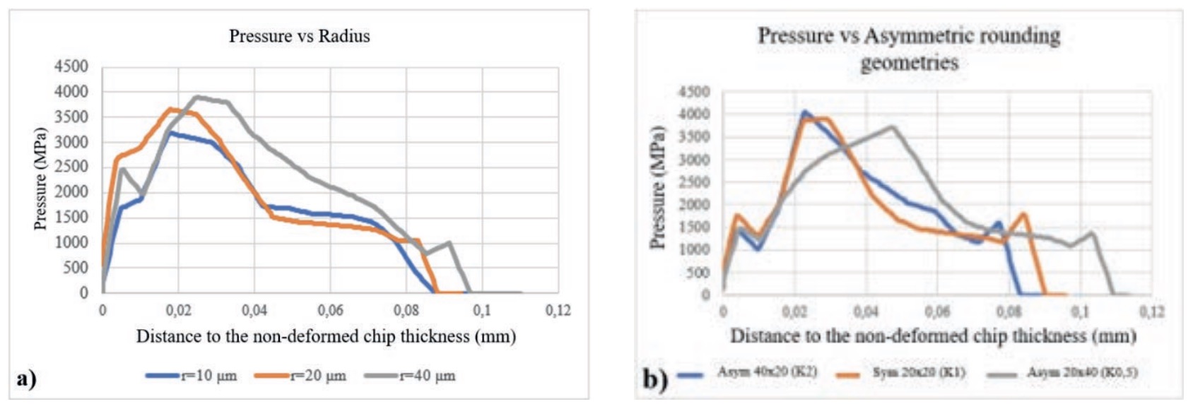 Figure 9 shows how the pressure on the tool varies as a function of the distance to the point where the tool loses contact with the machined surface, for the different edge geometries considered. Figure 9. Normal pressure distribution as a function of the distance to the end of the machined surface-tool contact; a) for tools with symmetric rounding and b) for tools with asymmetric rounding.