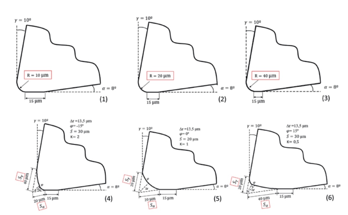 Figure 2 shows the six modelled cutting-edge geometries: four with symmetric rounding and two with asymmetric rounding. Of the four symmetric rounding geometries, the first three are established with cutting edge radii of 10, 20, and 40 ?m. The last symmetric geometry is defined using the geometric parameters and , which are commonly used to define asymmetric rounding. For this last symmetric geometry, a value of 20 ?m was set for both parameters ( and ), which corresponds to a cutting-edge radius of 16.91 ?m. Finally, the two asymmetric rounding modelled correspond respectively to the values and .