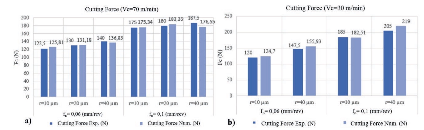 Figure 3. Experimental and numerically obtained cutting forces (Fc) for the 10 conditions considered for model validation. a) Cutting force for cutting speed Vc = 70 m/