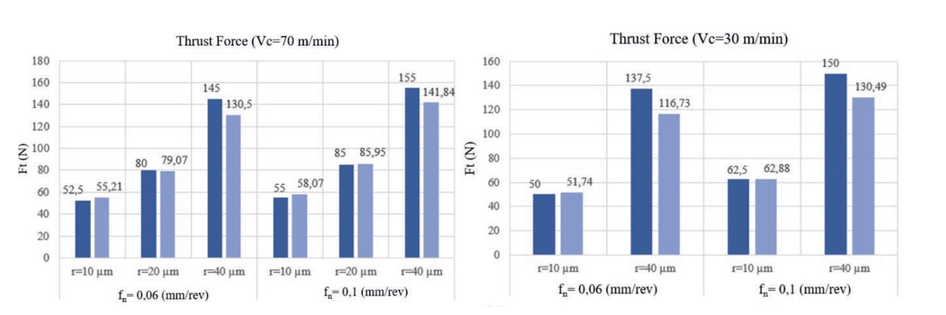 Figure 4. Experimental and numerically obtained thrust forces (Ft) for the 10 conditions considered for model validation. a) Thrust force for cutting speed Vc = 70 m/min;