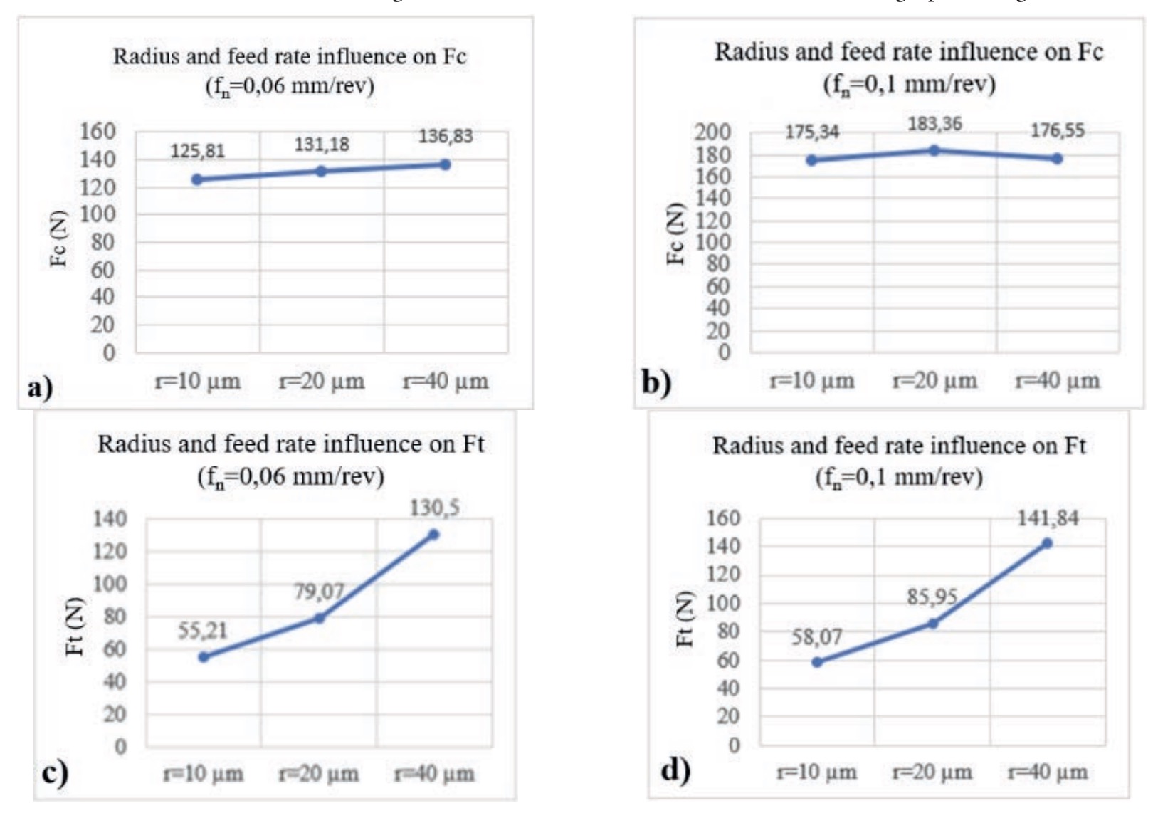 Figure 5. Influence of the cutting-edge radius and the feed rate on the cutting force and the thrust force for tools with symmetric rounding. a) Radius and feed influence on cutting force (Fc) for the feed rate fn = 0.06 mm/rev; b) radius and feed influence on cutting (Fc) for the feed rate fn=0.1 mm/rev; c) radius and feed influence on thrust force (Ft) for the feed rate fn=0.06 mm/rev; d) radius and feed influence on thrust force (Ft) for the feed rate fn = 0.1 mm/rev.