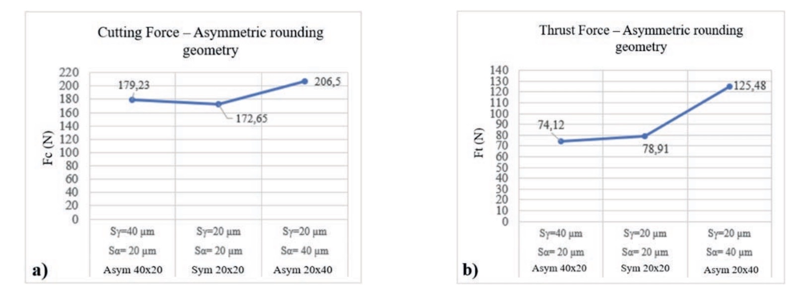 The most notable trend observed is that the asymmetric rounded tool exhibits thrust and cutting forces very similar to the symmetric rounded tool . However, for the asymmetric tool geometry , the thrust forces obtained are a 60 % higher and the cutting forces are 18 % greater. This result confirms the advantage of using tools with asymmetric edge rounding (in this case with geometries that satisfy ) because they allow for the combination of moderate cutting forces with increased edge robustness.