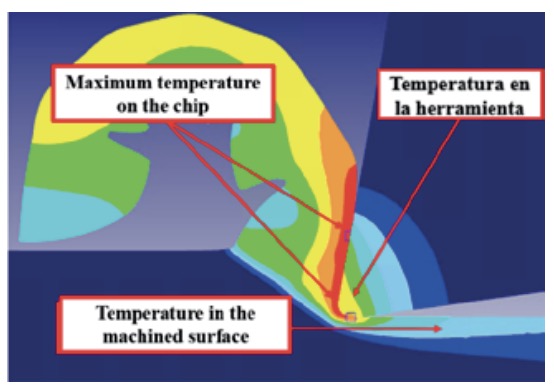 Due to the numerical simulations corresponding to extremely short cutting times (a few milliseconds), the temperature in the tool does not stabilize, reaching values much lower than those typical of titanium alloy machining. Therefore, the maximum temperatures in the cutting zone occur in the chip, specifically in the chip-tool contact area (Fig. 7).
