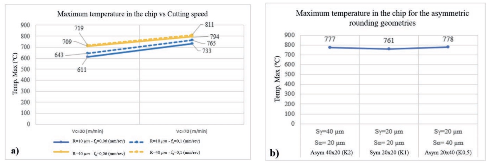 Figure 8. Maximum temperature reached in the cutting zone; a) for tools with symmetric rounding and b) for tools with asymmetric rounding (for the cutting parameters Vc = 70 m/min; fn = 0.1 mm/rev).