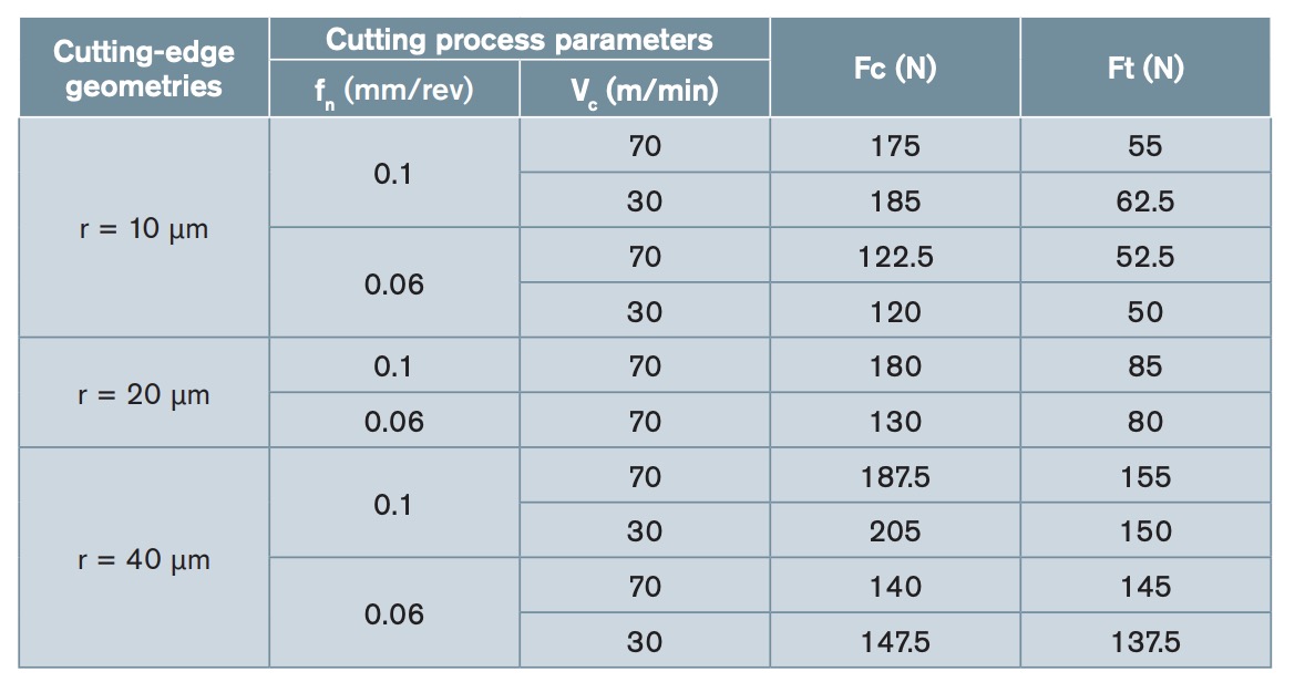 Table 1. Cutting edge geometries, cutting process parameters, and cutting forces (validation tests of the