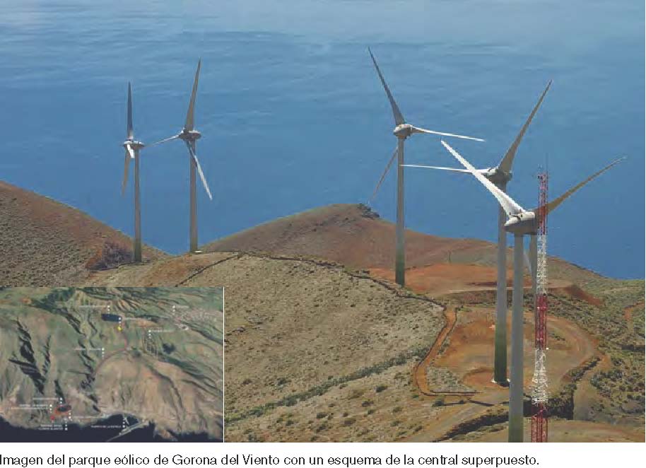 En este escenario, los ingenieros han diseñado un sistema compuesto por dos depósitos de agua –uno inferior, con capacidad para 225.000 metros cúbicos, y otro, superior, construido sobre una caldera volcánica natural, de 500.000 metros cúbicos, ambos conectados por tuberías de tres kilómetros de longitud–; un parque eólico integrado por cinco aerogeneradores, de 2,3 MW de potencia y más de 150 toneladas de peso y 64 metros de altitud cada uno; una central hidroeléctrica, con un salto neto de 682 metros, y una planta de bombeo de 6 MW. El proyecto se completa con una central de motores diésel que ya existía con anterioridad y que solo entraría en funcionamiento en casos excepcionales de emergencia en los que ni el agua ni el viento fueran suficientes para cubrir la demanda eléctrica.
