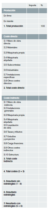 Cuando el porcentaje de estructura aplicado a las obras está por encima del coste de estructura real de la empresa, se podría dar la paradoja de que si bien el conjunto de las obras reflejan un resultado negativo, la empresa tiene beneficio. Si los costes imputados a las obras estuviesen por debajo de los reales, habrá que preguntarse si la dimensión de los servicios centrales de la empresa es acorde a la producción que ejecutan todas sus obras. Es razonable pensar que a menor producción se requiere menos estructura.