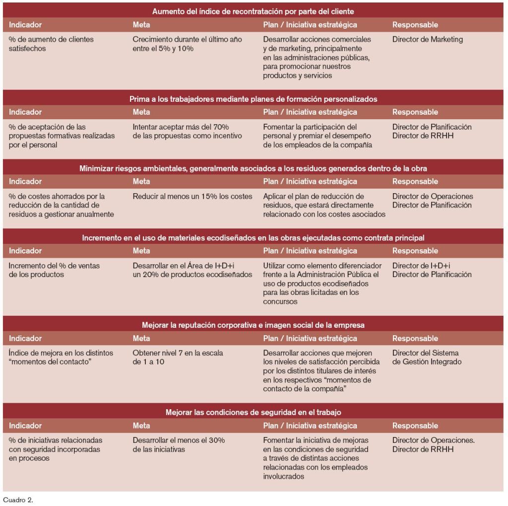 Una vez han sido definidos los indicadores y han sido relacionados con el mapa estratégico de la compañía, se elaboran el plan director de sostenibilidad definiendo los responsables para cada objetivo estratégico, estableciendo las metas para cada indicador, iniciativas y planes de sostenibilidad relacionados con cada indicador.
