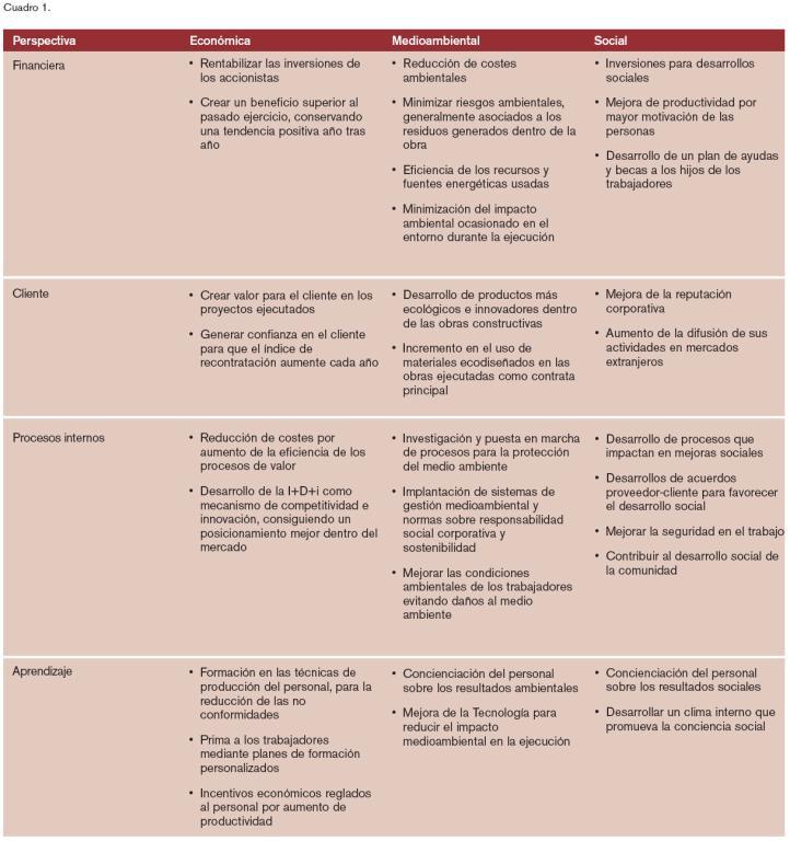 Teniendo en cuenta, además, que la estrategia de la empresa se basa en el fortalecimiento del mercado español y su expansión hacia el sur de Europa, y, además, uno de los pilares sobre los que se apoya es la responsabilidad social y la sostenibilidad de la compañía, se elabora la siguiente matriz, en donde se analizan los principales factores a tener en cuenta a la hora del desarrollo operativo, dentro de las cuatro perspectivas del cuadro de mando y de los tres principales ámbitos de la sostenibilidad: económico, medioambiental y social (Cuadro 1).