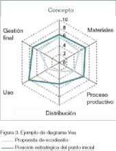 Los datos se sitúan en un diagrama tipo telaraña dividido en varios ejes como se puede observar en la figura 3. En cada eje se evalúan las distintas estrategias de mejora en diferentes aspectos del producto así como en las diferentes etapas del ciclo de vida, obteniendo un área que representa el impacto ambiental. Algunas de las estrategias que analizar pueden ser: aspectos funcionales; uso de materiales limpios, menor consumo de materiales y energía, reducidas emisiones durante el uso, etc. (Rieradevall y Vinyets, 1999).