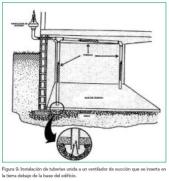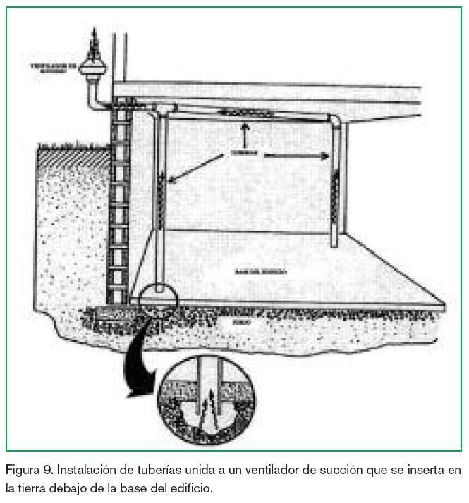 Despresurización del espacio entre el suelo del edificio y el terreno. Realizando una previsión de la posible entrada de radón en el interior de la casa. Este tipo de instalación resulta más fácil en la etapa de construcción del edificio (figura 9).