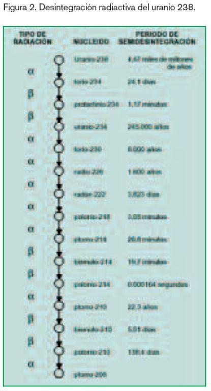 El gas radón procede del decaimiento radiactivo del radio la cadena de decaimiento (figura 2) comienza con el uranio238 (238U), hasta llegar al radio226 (226Ra), que tiene un período de desintegración de 1.600 años. Una vez formado el radio226 (226Ra), éste decae hasta formar el radón 222 (222Rn), siendo el período de desintegración de 3,8 días aproximadamente, tiempo suficiente para propagarse por la tierra y dentro de sus hogares, donde adicionalmente se origina una desintegración produciendo los descendientes del radón, llamadas “hijas del radón”. Esta desintegración es la fuente principal de exposición humana a la radiación alfa (a), ya que esta desintegración produce cuatro isótopos con un período de vida de al menos 30 minutos. Esta radiación alfa (a) es de gran energía y está compuesta de dos protones y dos neutrones pudiendo ocasionar daños en el organismo humano por una alteración celular en la zona respiratoria, la cual puede generar enfermedades, como el cáncer de pulmón.