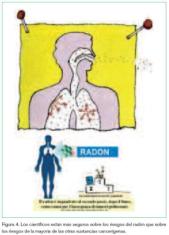 El radón, como gas, no es retenido de forma significativa en el aparato respiratorio; sin embargo, sus descendientes sí. La progenie del radón puede ser inhalado (figura 4), libremente, unido a otras partículas o unido al polvo aerotransportado. Las partículas mas pequeñas pueden depositar esta progenie del radón profundamente en el tejido bronquial y pulmonar, ya que tienden a unirse al epitelio pulmonar. Gracias a la acción de la mucosa pueden ser desprendidas de la zona respiratoria pero, debido a su corto período de tiempo, pueden lanzar partículas alfa en su desintegración antes de ser eliminado de los conductos respiratorios. Estas emisiones que ocurren dentro de los pulmones pueden ocasionar daños genéticos pudiendo alterar el tejido bronquial y pulmonar, con un posible cáncer de pulmón.