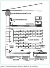 Por ejemplo, en un edificio (figura 5) el radón se filtra del suelo donde esta asentado a través, sobre todo, de los agujeros de desagües, grietas en el pavimento, fisuras en las paredes y por las características propias de los materiales de la casa. Otra ruta de entrada del radón es el aire que proviene del exterior o liberado a partir del agua.