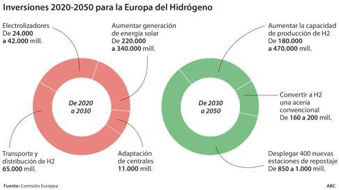 Hasta 2050, las inversiones en capacidad de producción serían de entre 180.000 y 470.000 millones de euros en la UE. Por último, la adaptación de los sectores de uso final al consumo de hidrógeno y a los combustibles a base de hidrógeno también requerirá importantes inversiones. Por ejemplo, se necesitan aproximadamente entre 160 y 200 millones para convertir al hidrógeno una acería típica de la UE que llega al final de su vida útil. En el sector del transporte por carretera, el despliegue de otras 400 estaciones de repostaje de hidrógeno a pequeña escala (frente a las 100 actuales) podría requerir inversiones de entre 850 y 1.000 millones de euros. En total este segundo período supodría una inversión mínima de 181.000 millones de euros adicionales, con un máximo previsto de 471.200 millones.