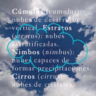Cúmulo, del latín cumulus, que significa «del montón». Según el diccionario de la RAE, se definiría como un «conjunto de nubes propias del verano, que tiene apariencia de montañas nevadas con bordes brillantes.» Estrato, del latín stratus. Significa capa y tiene por definición según la RAE: «Nube que se presenta en forma de faja en el horizonte». Cirro, del latín cirrus o rizo de pelo; sería una forma de fibras paralelas, extensibles por el aumento de cualquiera o todas las direcciones. Para denotar que una nube era el acto de la condensación, añadió una cuarta categoría: Nimbo, del latín nimbus, nube que se define como una «nube grande, baja y grisácea, portadora de lluvia, nieve o granizo» (Diccionario de la RAE).