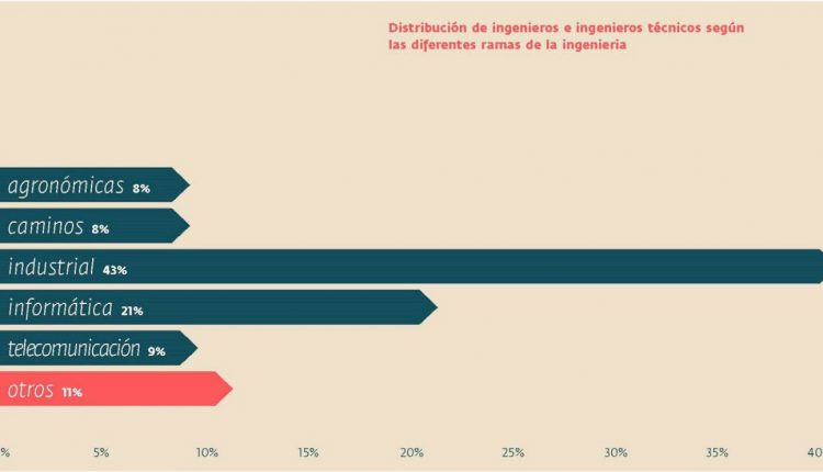 En cuanto a la distribución de profesionales de la ingeniería en España, se desglosa de la siguiente manera: ámbito de la Ingeniería industrial (43%), Ingeniería informática (21%), Ingeniería de telecomunicación (9%), Ingeniería agrícola/ agrónomos (8%), Ingeniería de Caminos/Civil (8%) y otras ingenierías (11%).