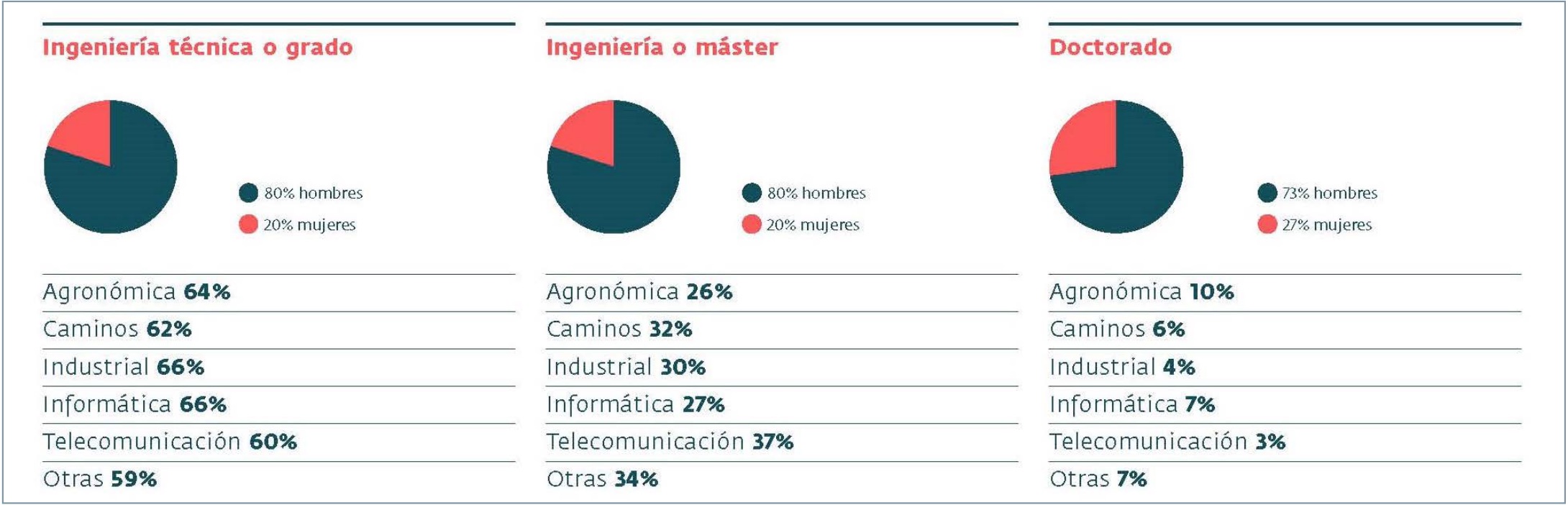 Por ramas de la ingeniería, la presencia de mujeres está distribuida de la siguiente manera: Ingeniería agrícola/ agronómica (34%), Ingeniería de caminos (24%), Ingeniería industrial (19%), Ingeniería informática (16%), Ingeniería en telecomunicación (12%) y otras ingenierías (24%).