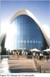 También se encuentra en la ciudad de las Artes L’Oceanogràfic (Figura 10), un viaje submarino para conocer la fauna y flora marina más representativa del mundo. Uno de los elementos más singulares de la construcción de L’Oceanogràfic son los “ventanales” de los acuarios que permiten la contemplación de los animales. Están construidos con un material plástico llamado acrílico. Con el acrílico se puede modelar con relativa facilidad permitiendo realizar estructuras curvas como los túneles subacuáticos (figura 11). El delfinario de L´Oceanografic permite conocer a los delfines. Con un total de cinco piscinas que contienen 26 millones de litros de agua y una profundidad de 10,5 metros, el delfinario garantiza las mejores condiciones para el estudio y exhibición de un grupo de delfines mulares (figura 12).