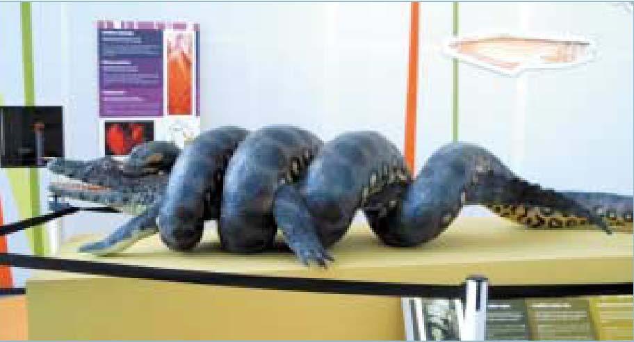 En el Museo de las Ciencias conoceremos de forma didáctica y amena, todo lo que la ciencia y la tecnología han hecho por mejorar la calidad de vida de la humanidad. En el pabellón de entrada nos encontramos con una escultura alegórica al ADN (figura 4). En el espacio dedicado a los deportes se puede escuchar una clase magistral de Martina Higgins sobre el cálculo de la parábola que debe describir la bola tras un saque a más de 160 km/h, la opinión de Rivaldo sobre ergonomía en los tacos inteligentes acoplados a pelotas de fútbol, o los comentarios de Indurain sobre la reducción del coeficiente de rozamiento conseguido a través de un diseño por ordenador del chasis de su bici; así como ejercitar todas las actividades y medir los resultados. En la figura 5 tenemos uno de sus muchos locales. En la zona dedicada a la paleontología se pueden contemplar esqueletos de dinosaurios (figura 6). En la sala dedicada a los temas africanos se muestran marionetas con movimiento que reproducen escenas históricas (figura 7). Es sorprendente la representación de una anaconda apresando a un cocodrilo (figura 8). A lo largo de toda la exposición del museo hay representaciones en pancartas y dioramas explicativos de los diversos temas, sirva como ejemplo el dedicado a explicar la constitución de la célula (figura 9).