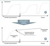 Así mismo, para las empresas, el reemplazo de este personal formado en la experiencia durante años en ese entorno industrial supone un gran quebranto operativo, costes de acoplamiento del nuevo personal y la pérdida de conocimiento estratégico, que en muchos casos pueden afectar a la producción. En la figura 1, en la parte superior (A), se observa la curva de asimilación y experiencia en función del tiempo de permanencia que normalmente se observa en las organizaciones de mantenimiento. En ella se ve que el cambio del operario o sustitución conlleva un tiempo de acoplamiento, con menor operatividad hasta el acoplamiento en el entorno en el que debe operar. Un modelo de gestión del conocimiento en mantenimiento debe llevar a aunar esfuerzos para capturar esa experiencia o conocimiento tácito, reduciendo dichos tiempos de acoplamiento (figura 1B), pasando dicho conocimiento al resto de personal de la organización.
