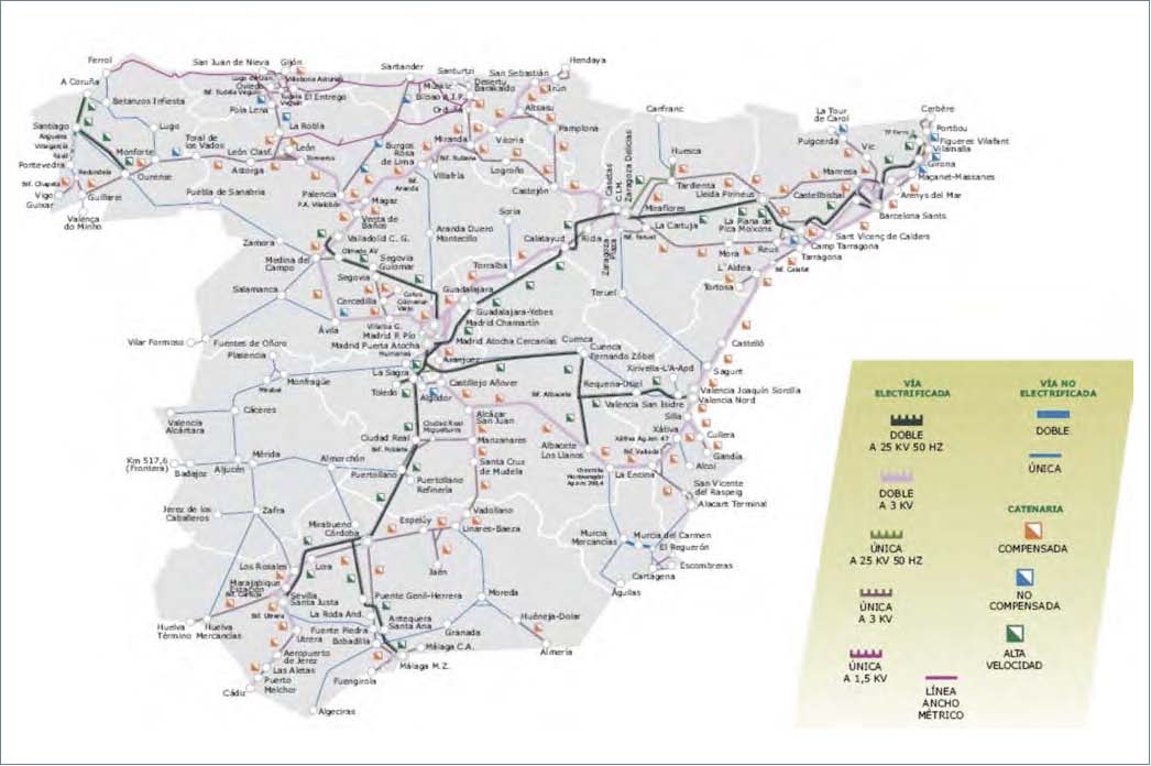 – Ancho ibérico (1.668 mm): 11.750 km de vías; 2.914 km de vía doble electrificada, 74 km de vía doble sin electrificar, 3.576 km de vía única electrificada, 5.191 km de vía única sin electrificar, 3.000 V, CC.