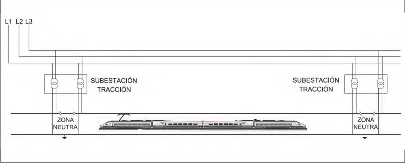 La energía requerida para alimentar las subestaciones de tracción monofásicas a 50 Hz se obtiene conectando a dos fases de la línea de alta tensión trifásica de la compañía suministradora o red de transporte. Típicamente se conectan a redes de 132 kV, 220 kV o 400 kV. Una salida del secundario del transformador de tracción se conecta a la línea aérea de contacto y la otra al carril, estando este unido rígidamente a tierra. Esta carga bifásica provoca desequilibrios en la tensión y corriente de la red trifásica.
