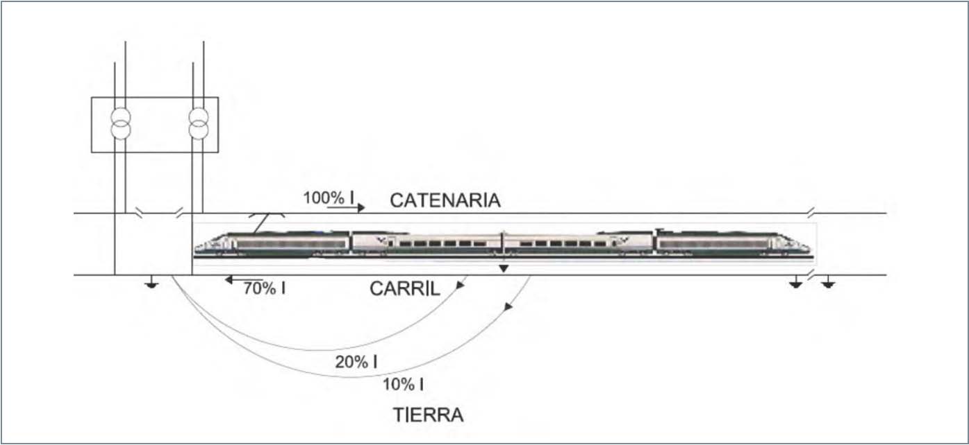 El retorno de corriente se realiza en gran parte por los carriles. Se calcula que del orden del 70% de la corriente retorna por el carril, mientras que el 10% lo hace por capas profundas del terreno y el 20% por capas más superficiales, provocando perturbaciones en los cables de señalización y comunicaciones cercanos a la vía. La distancia media entre subestaciones es de 40 km, aproximadamente (figura 4).