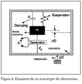 Para convertir energía mecánica en energía eléctrica uno deberá ser capaz de realizar un movimiento entre dos partes mecánicas de un generador (el rotor y el estátor de un generador macroscópico). Las vibraciones consisten, sin embargo, en el viaje de una onda dentro o sobre un material sólido, por lo que no es a menudo fácil encontrar un movimiento relativo dentro del alcance de un pequeño generador. Por consiguiente, habrá que acoplar el movimiento de vibración por medio de la inercia o una masa oscilante. El sistema tradicional de modelado de este fenómeno se ve en la figura 4, en el que se muestra una masa suspendida por un muelle con una constante elástica k mientras su movimiento es amortiguado por un amortiguamiento parásito d debido a la fricción con el aire, en combinación con un amortiguamiento dg inducido por el generador7 .