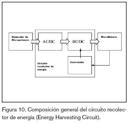 Como la señal que viene del microgenerador es alterna (generalmente), para poder cargar baterías necesita ser rectificada, por lo que se debe utilizar un convertidor AC/DC. Además, se suele usar un convertidor DC/DC para adaptarlo a la carga. El convertidor DC/DC puede ser accionado por un controlador que genera una señal de pulso modulado en anchura (PWM) para maximizar la transferencia de energía entre el microgenerador y los módulos de almacenamiento. La figura 10 muestra la composición del esquema general que se usa en estos dispositivos de autoalimentación.