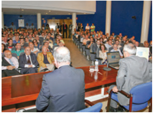 La intervención, ya por la tarde, del presidente del Cogiti cont? con una masiva y expectante asistencia. Vicente Martínez García desarrolló su conferencia en torno a dos interesantes temas: La transposición de la Directiva de Servicios e influencia de los colegios profesionales de Ingeniería y El acceso de los ingenieros técnicos industriales a los nuevos títulos de grado.