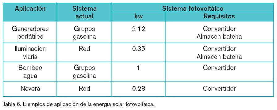 Se presentan, finalmente, a título de ejemplo, dos tablas con algunos datos significativos. La primera de ellas (tabla 5) destaca el potencial de la energía hidráulica a nivel mundial y la tendencia en el grado de aprovechamiento. La segunda (tabla 6) ofrece algunas aplicaciones interesantes de la energía solar fotovoltaica.