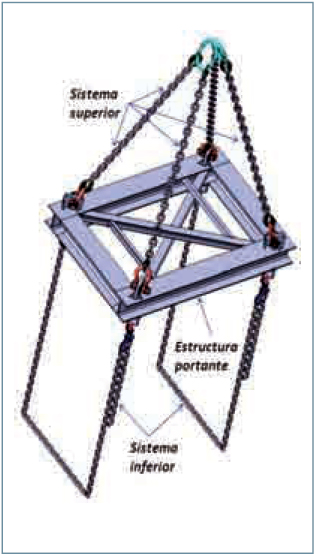 a) La estructura portante formada por perfiles normalizados y cortes de chapa, con dimensiones adaptadas a los tamaños de bloques que se pretenden izar y cuyo objetivo es doble: primero acoplar y distribuir las cargas entre las unidades de eslingado superior e inferior y, en segundo lugar, servir de soporte al dispositivo de aviso de ausencia de equilibrio.