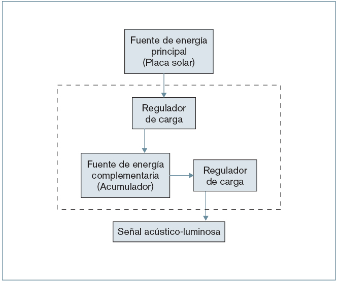 b) Un conjunto de aparataje eléctrico compuesto por la señal acústica y luminosa que emite el aviso de falta de equilibrio y que está alimentada por un acumulador y un regulador de carga conectado a una placa solar que garantiza su funcionamiento. Así se evita la descarga prematura del acumulador y se garantiza, a su vez, que tenga el mínimo mantenimiento posible. La determinación de esa falta de equilibrio se realiza a través de un inclinómetro que, junto con el acumulador y el regulador de carga, se encuentran protegidos del entorno y las inclemencias atmosféricas mediante un resguardo o caja eléctrica con la protección IP necesaria (figura 7).
