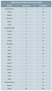 Las explotaciones de yeso en España, así como el número de empleados a los que dan ocupación, de forma directa, dichas explotaciones en el sector de producción de yeso a nivel nacional (especificado por provincias), asciende a un total de 88 explotaciones y una empleabilidad directa de 491 personas, como se muestra en la tabla 4.