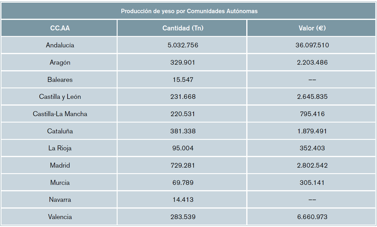 La producción de yeso a nivel nacional contemplados en la base de datos oficiales del Ministerio de Industria, Energía y Minas de España [9] goza de buen estado, así como de reservas suficientes, lo que resulta ser un material en abundancia en nuestra geografía, y económico para su utilización. La evolución de esta materia prima en los últimos años, expresada en miles de toneladas anuales, se muestra en la tabla 1.