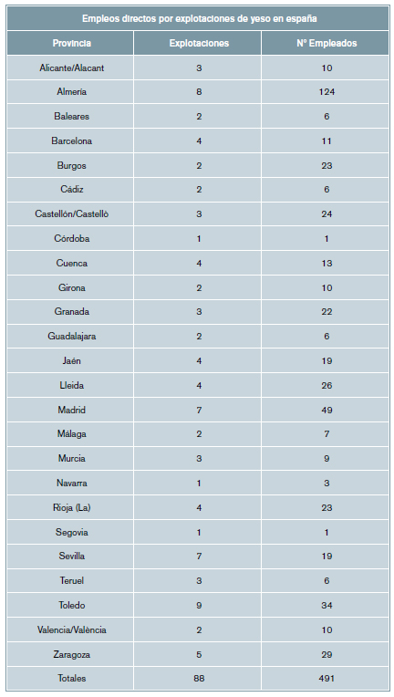Las explotaciones de yeso en España, así como el número de empleados a los que dan ocupación, de forma directa, dichas explotaciones en el sector de producción de yeso a nivel nacional (especificado por provincias), asciende a un total de 88 explotaciones y una empleabilidad directa de 491 personas, como se muestra en la tabla 4.
