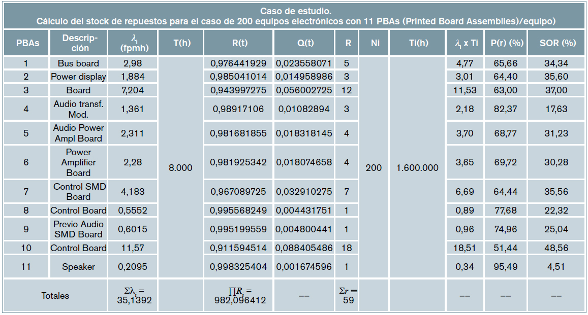 j: nº de fallos durante el tiempo acumulado T; r: nº de repuestos; T = N.t: tiempo acumulado; N: cantidad de unidades; λ: tasa de fallos en fpmh o en f/c.h.; Pr: función distribución o probabilidad de que fallen de 0 a r unidades (de tener repuestos); Stock Out Risk (SOR): probabilidad de no tener repuestos = 1-P(r)