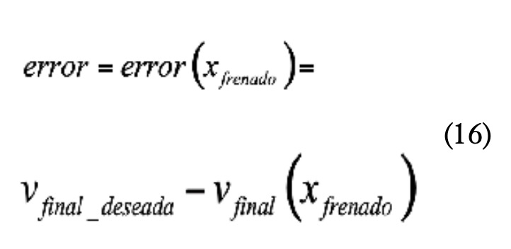 Teniendo en cuenta las condiciones de contorno indicadas al final de la recta y que el punto de frenado está situado dentro de la recta, se utilizará una variante mejorada del algoritmo de bisección que permite calcular raíces de una función de una variable en un intervalo conocido llamado algoritmo Illinois (McNamee, 2013). La función de la que hay que obtener la raíz será la indicada en la expresión (16), donde vfinal_deseada es la velocidad a la que se toma la siguiente curva y vfinal es la velocidad al final de la recta tras frenar en el punto de frenado xfrenado.
