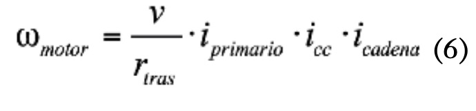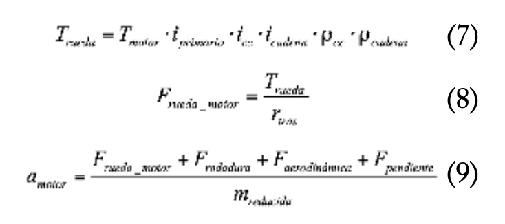 A continuación, se puede calcular el par que suministraría el motor a la rueda con la expresión (7), la fuerza de tracción que se generaría, suponiendo una situación de no deslizamiento del neumático, con la expresión (8) y la máxima aceleración que permitiría el motor con la expresión (9).