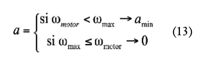 De las tres aceleraciones calculadas, se escogerá la mínima aceleración de las tres amin y se implementará un límite adicional cuando el motor haya alcanzado su máxima velocidad operativa con la expresión (13).