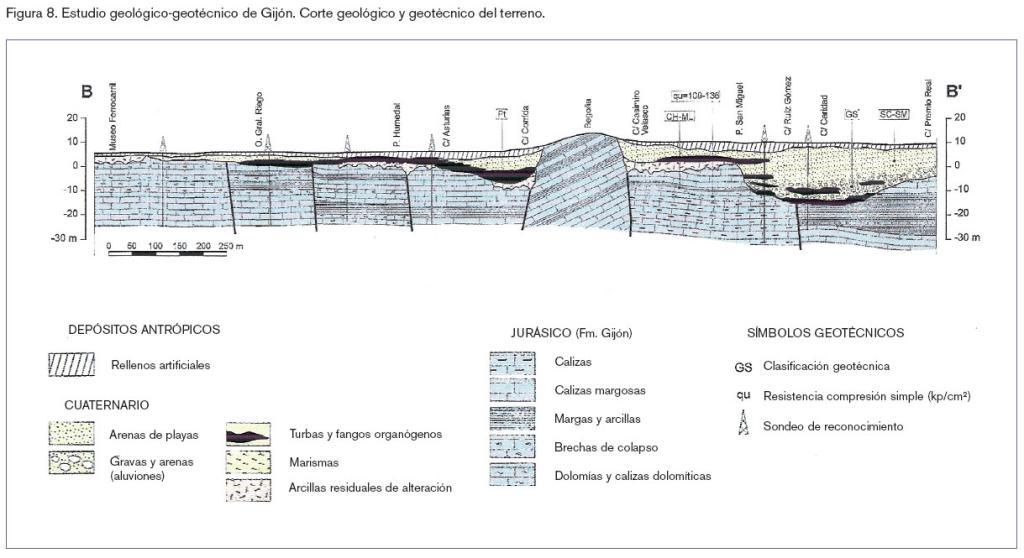Además, la cartografía geotécnica de Gijón permite extraer información adicional sobre la tipología del subsuelo en el emplazamiento de los bloques. La misma ha sido confeccionada en base a la consulta de un elevado número de informes geotécnicos, una minuciosa labor de muestreo, recopilación e interpretación de muchos datos puntuales extraídos de pequeños afloramientos, trabajos superficiales (calicatas, zanjas, excavaciones, etc.) y de campañas de prospección del terreno, sobre todo, de la valoración de 1.114 sondeos mecánicos, con un total de 14.737 m lineales de perforación.