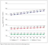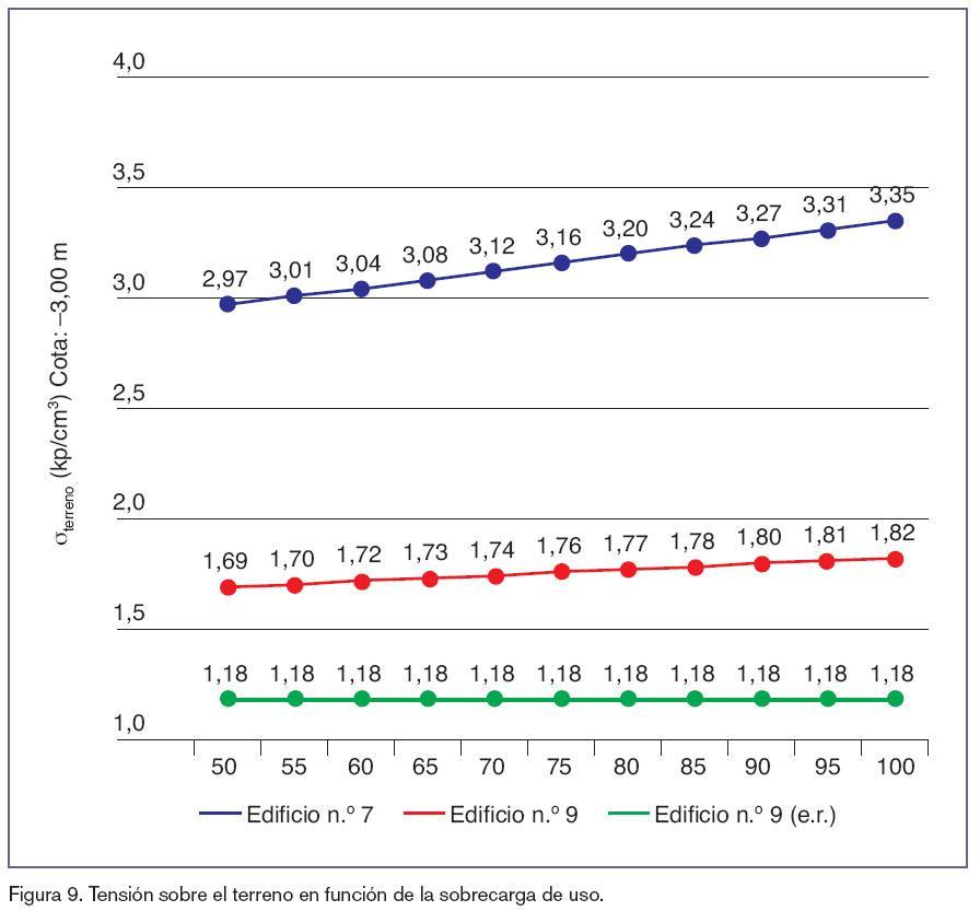 En la representación gráfica de los resultados (figura 9) se indica la evolución de la tensión vertical sobre el terreno (p.p. más s.u.) a medida que se incrementa la sobrecarga de uso en ambos edificios. Además, para el bloque n.o 9 se representa también la tensión producida por el esqueleto resistente del mismo, la cual es constante e independiente –en este estado de la construcción– de la aplicación de sobrecarga de uso alguna, al objeto de compararla con la del bloque n.o 7.