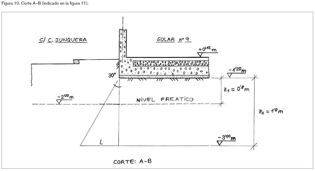 El cálculo de la presión sobre el estrato de cota –3,00 m, se determina entonces, suponiendo una presión uniforme sobre el mismo, en la superficie o plano horizontal de influencia limitado por las intersecciones de planos verticales trazados por los lados del perímetro de la losa de cimentación, excepto en el lado de la losa que da a la calle Celestino Junquera, en que se toma la superficie limitada por su intersección, con un plano trazado por dicho lado de la citada losa, pero que forma en este caso un ángulo de 30º con la vertical (figura 10).