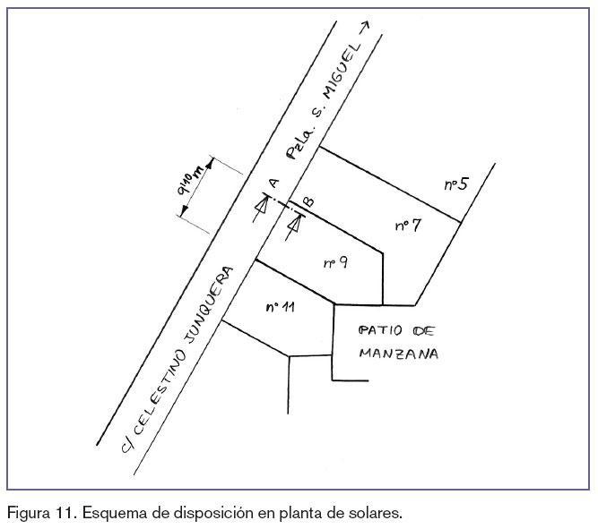 Como se ha mencionado, el solar del bloque n.o 9 es un pentágono no regular, en el que cuatro de sus cinco lados limitan con las edificaciones colindantes; está ocupado en su totalidad por la losa de cimentación, y el único lado exento de la misma es el que da a la calle Celestino Junquera. Por tanto, a efectos de establecer una distribución de tensiones verticales bajo la losa de cimentación, al objeto de determinar las presiones en capas profundas, parece prudente considerar como único lado de la losa de cimentación exento o libre –en planta– el correspondiente a la fachada perteneciente a la citada calle.