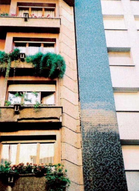 4. No se puede afirmar que el edificio n.o 7 se apoye en el n.o 9: el primero está inclinado con un desplome importante; su asiento se debe, en parte, a la posterior construcción del actual bloque n.o 9; la pérdida de la verticalidad del n.o 7 ha llegado a hacer que se toquen sus esquinas superiores, pero sin fuerza apreciable de contacto entre ellas. En este caso, hay que rechazar la hipótesis de que un edificio se apoye en el vecino y sea la causa de las grietas, pero se acepta la hipótesis de que se ha inclinado por sus asientos diferenciales.