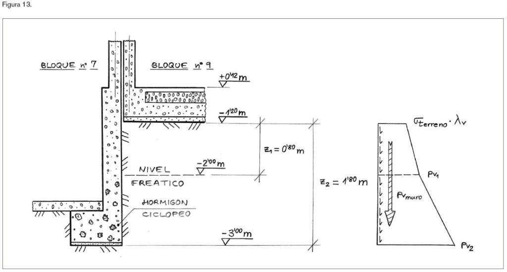 Como carga vertical q se adoptan los siguientes valores representativos de la tensión sobre el terreno bajo la losa de cimentación (cota de –1,2 m) del bloque n.o 9:
